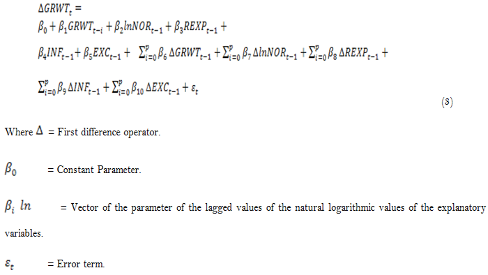 Equation 1 was transformed into econometric model before estimation and two variables (NOR & REXP) were in natural logarithm. Thus, the model is specified below;