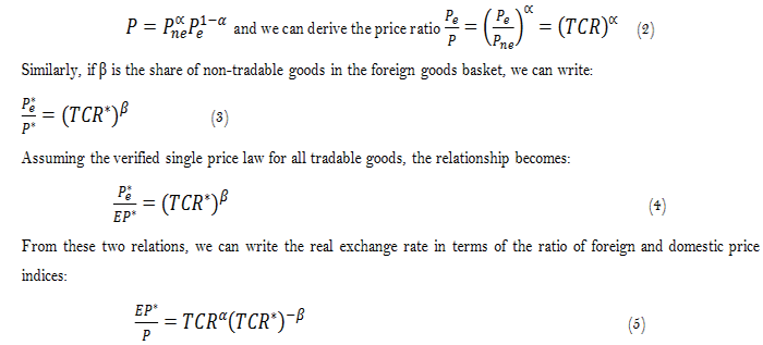 It therefore appears that even in the case where the assumption of the law of the single price is verified for tradable goods, the two exchange rates maintain a simple relationship only if the relative price of tradable goods, foreign non-tradables remains constant. In this case, the ratio of domestic and foreign price indices is proportional (in logarithm) to the real exchange rate estimated as the relative price of tradable goods. Strictly speaking, the real foreign exchange rate (RER *) has no reason to remain constant.