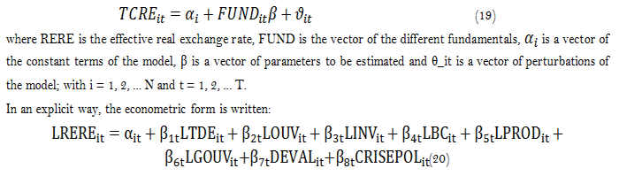 From the technical point of estimation, it is worth highlighting the use of time series and panel data. Identifying the long-term relationship between the real exchange rate and its fundamentals, leads to the use of an error-correction model. Thus, when it comes to panel data, the error-correction model results in one of the techniques of Pooled Mean Group developed by Pesaran et al. (1999). Pooled Mean Group’s estimation makes it possible to have both the long run relationship and the short run relationship; it makes it possible to correct the problems of endogeneity of the model and to take into account the heterogeneity country. Despite all the empirical work done, the fact remains that this subject remains relevant because of the profound changes in the world economy. The financial crisis of 2008, the strong appreciation of the euro and the post-election crisis in Côte d'Ivoire are important factors that will have an impact on the CFER of the CFA franc and its fundamentals in WAEMU.