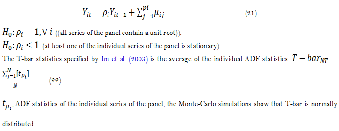 As pointed out in the work of Okey (2009) the traditional Dickey-Fuller augmented unit root test (ADF) suffers from a problem of weak rejection of the null hypothesis of series stationarity, especially for short period. Thus, recent literature shows that stationarity tests on panels are more powerful than those based on individual time series (Al-Iriani, 2006). Among the recently developed tests we have, the unit root test LLC Levin, Lin, and Chu (2002); IPS by Im, Pesaran, and Shin (2003), Hadri (2000) and Breitung, Shu, and McMahon (2000). Narayan and Smyth (2009) used the Breitung et al. (2000) because this test is generally more robust than any first-generation panel unit root test. Apergis and Payne (2009) use the IPS test which is more general and popular and based on the principle of ADF testing. Note that the unitary panel test of Breitung et al. (2000) and Levin et al. (2002) assumes a homogeneous autoregressive unit root (under the alternative hypothesis, the autoregressive coefficient is the same for all individuals for the LLC test), whereas Im et al. (2003) assume a heterogeneous unit root (the alternative hypothesis), allows the presence of a subset of individuals of size N1 whose variable of interest follows a stationary process. The unit root tests of Im et al. (2003) therefore take heterogeneity into account (Hurlin & Mignon, 2005).