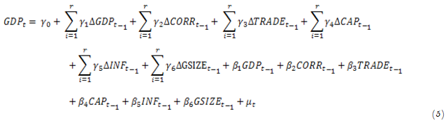 The possibility of a bidirectional relationship between corruption and economic growth presents a potential problem of endogeneity in empirical estimations. As a result, we employ the ARDL technique, which has the potency to correct simultaneity issues through the inclusion of an unrestricted number of lags for the regressed and regressors. The application of ARDL estimator is also informed by the fact that it is very efficient in studies adopting small or finite samples (Pesaran, Shin, & Smith, 2001). In applying the ARDL bounds test approach to cointegration to determine the long-run relationship between economic growth and the other variables we initially estimate Equation 4 with an ARDL specification of the form: