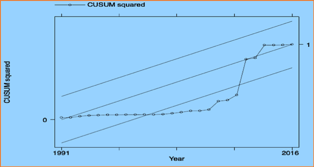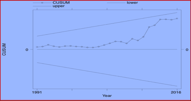 The ARDL estimates were very robust as evidenced by the results of the diagnostic tests performed as shown in Table 7. The model has good fit and passed all diagnostic tests as shown in the table. It has also passed parameter stability test as exhibited by graphs of the recursive residuals shown in Figures 5 and 6.