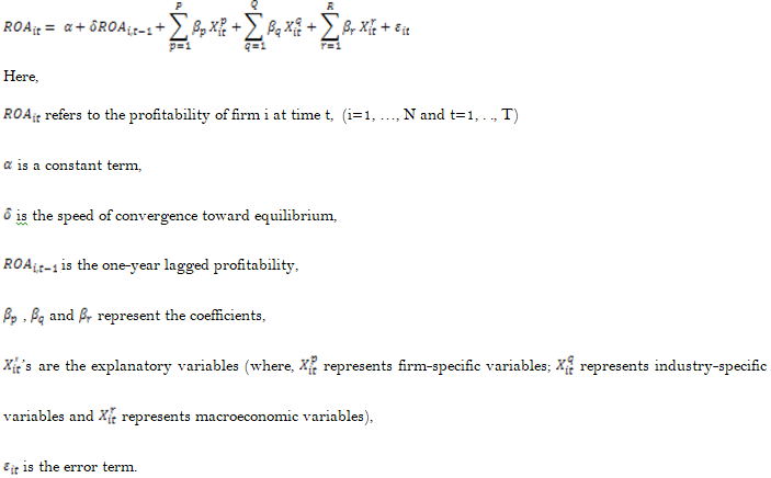 In the estimation model, a dynamic component is introduced in the form of a lagged dependent variable as a regressor. Since it is assumed that the profitability of the current year to some extent is related and influenced by the previous year’s profitability of the firm, the study introduced a lagged dependent variable.