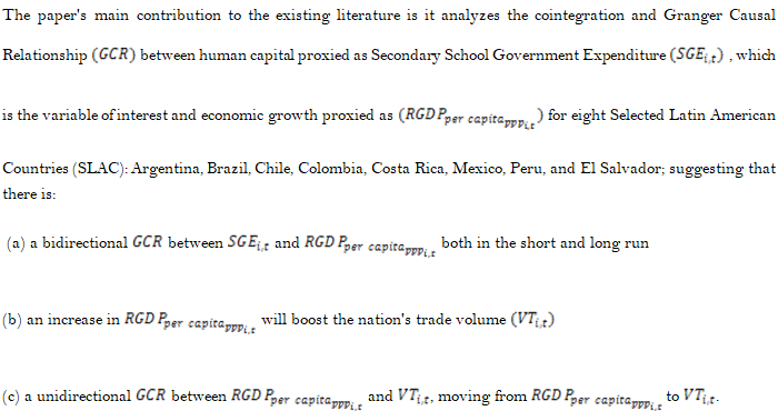The paper's main contribution to the existing literature by investigating the cointegration and Granger causal relationship between human capital and economic growth for eight selected Latin American countries: Argentina, Brazil, Chile, Colombia, Costa Rica, Mexico, Peru, and El Salvador. The study is one of the few studies which have examined this relationship, which makes it unique and of great value to the field of economics and economic development.
