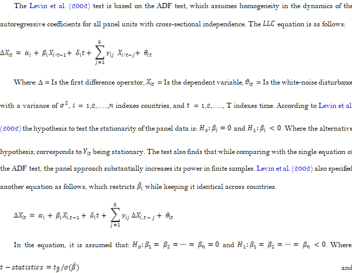 Levin, A., Lin, C.-F., & Chu, C.-S. J. (2002). Unit root tests in panel data: Asymptotic and finite-sample properties. Journal of Econometrics, 108(1), 1-24. Available at: https://doi.org/10.1016/S0304-4076(01)00098-7.
