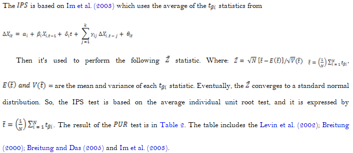 Im, K. S., Pesaran, M. H., & Shin, Y. (2003). Testing for unit roots in heterogeneous panels. Journal of Econometrics, 115(1), 53-74. Available at: https://doi.org/10.1016/S0304-4076(03)00092-7.