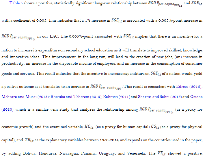 In conclusion, this paper adopted the Mankiw et al. (1992) technique and supports that education is imperative for economic growth and development for the SLAC. Despite this widespread belief that investment in education is a key determinant of economic growth and shortly will lead to economic development, the empirical estimations, especially focusing on low-income countries, are less than conclusive. Quiggin (2002); Devarajan, Swaroop, and Zou (1996); Benhabib and Spiegel (1994). This can be attributed to how schooling, investment, and successes are measured.