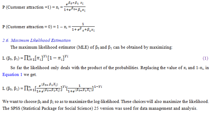 Let Yi=Customer attraction denote the dependent variable for the ith observation and Yi = 1 if the customer attraction is “Yes”, and Yi = 0 if the customer attraction is “No”. The explanatory variables can be quantitative or indicator variables referring to the level of categorical variables. Since Y is a binary variable, it has a Bernoulli distribution with parameter πi,