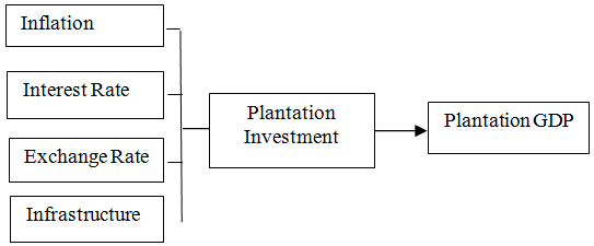 The plantation industry can absorb a large number of workers so that it can reduce the unemployment rate but its performance is still low. Interest rates affect plantation investment, thus high-interest rates can harm plantation investment. Plantation investment is strongly influenced by the rupiah exchange rate because most of the plantation products used are imported from abroad. Fluctuating inflation affects plantation investment. Thus, high inflation affects plantation investment. Infrastructure greatly affects plantation investment, thus high infrastructure can affect plantation investment. The following is a schematic framework for the relationship between variables in the study as shown below Figure 2: