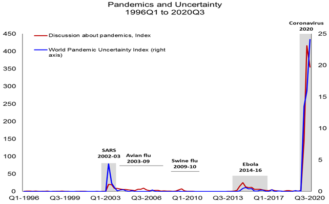 The pandemic's impact has an extreme uncertainty about the length, path, and extent, which could develop a vicious cycle of tightening financial conditions and dampening consumer and business confidence; this could lead to investment and job losses (Chudik et al., 2020). The possible questions that any empirical study would seek to answer are; (i) what unprecedented shocks have the pandemic caused considering the cross-country spillovers? (ii) how to quantify the unprecedented uncertainty concerning forecasts? Figure 2 depicts the uncertainty level that the pandemic has caused the world. The figure shows that the COVID-19 pandemic has caused an outrageous uncertainty more than any other pandemic experienced. Comparing the COVID-19 pandemic to SARS, which somewhat caused heightened uncertainty in 2002 and 2003, is unmatched. The levels of the COVID-19 far exceed any other pandemic experienced globally.