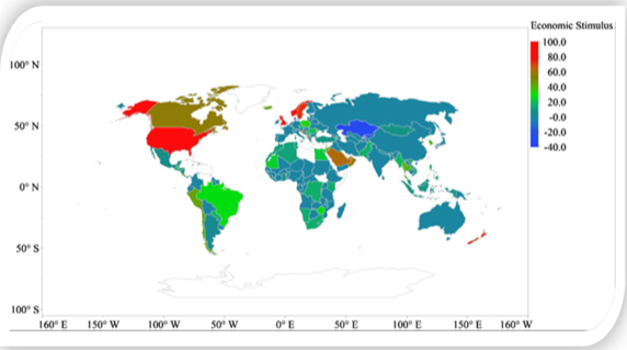 In Figure 4, the economic stimulus packages as a percentage of GDP provided by governments across the globe are presented. Countries that provided the highest economic stimulus packages are Bahrain, Malta, Austria, Luxembourg, France, Oman, Belgium, Sweden, Germany, and Malaysia as the top 10 countries with stimulus packages as a percentage of GDP ranging from 31.30, 25.61%, 25.11%, 22.91%, 22.59%, 22.59%, 19.61%, 18.65%, 17.29%, and 16.42%, correspondingly. In obvious ways, governments' choices of economic stimulus packages were dependent on their economic stringencies and sovereign credit ratings to mitigate the economic turndown that resulted from the pandemic.