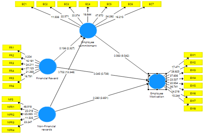 After assessment of measurement model through PLS algorithm, model was assessed through structural equation modeling using bootstrapping to test the hypothesis. Results of hypothesis of current study are depicted in Table 4. and Figure 3. Out of 7 hypothesis (5 direct hypothesis and 2 indirect hypothesis) one direct hypothesis was not accepted which was predicted as “financial rewards has positive significant influence on employee commitment” current study found positive but insignificant results (β=0.044, t value = 0.46, p value = 0.46) so based on p value this hypothesis was considered as rejected. While applying mediation of employee commitment between relationship of financial rewards with employee motivation, current study found significant results (β= 0.077, t value = 2.196, p value =0.028) and considered as accepted. Beside this employee commitment also found as significant mediator between relationship of non-financial rewards with employee motivation (β=0.395, t value =7.966, p value <=0.000). Rest of the hypothesis were found according as hypothesized based on evidences in literature.
