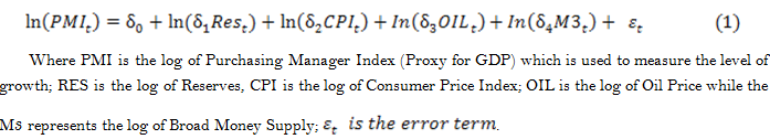 The parameters in Equation 1 capture the response of PMI to changes in its determinants. While the a priori expectations of M3, Oil Price and Reserves coefficients are to maintain positive relationship with PMI, the CPI is expected to relate negative.