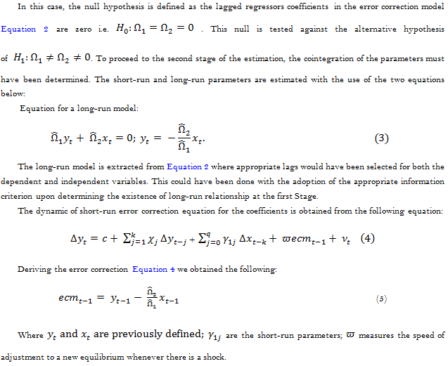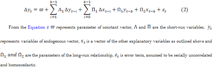 Accoding to Pesaran and Shin (1998) the ARDL has 2-stage processes of cointegration technique in the estimation of a long-run relationship between two variables. The Fisher F-test or standard Wald test is deployed in the first stage to ascertain the existence of cointegration amongst the variables (bounds testing).