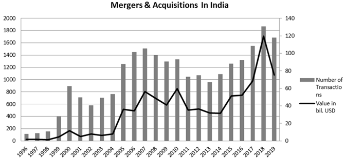 The opening of economy post the 1990s have surged an era of M&A deals in India , though they were not uncommon before, but with a lower frequency (Bhoi, 2000). The government's liberal economic policy after the 1990s allowed enterprises to undergo technological growth, diversification and upgradation. A number of businesses have found it necessary to combine with comparable business units and subsidiaries in order to achieve cost savings and improved productivity. As shown in Figure 1, the quantum of deals in India has seen a steady rise since 2013, with a reciprocal increase in the total quantity of deals undertaken. In 2015, businesses reported more than 1200 transactions for a total sum exceeding USD 51 billion. The volume of transactions have shown to have a growth of 63 percent compared to 2014 (The Institute for Mergers Acquisitions and Alliances (IMAA), 2019).