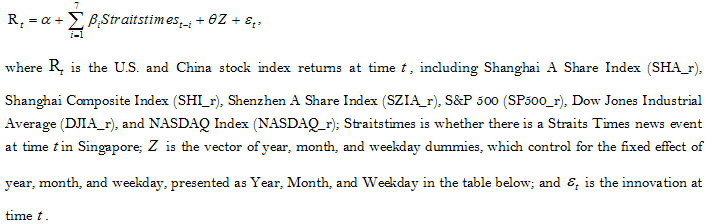 In terms of the other news media in Asia, we evaluate the Straits Times of Singapore and its influences of U.S.-China trade conflicts news on U.S. and Chinese stock returns according to the following regression model: