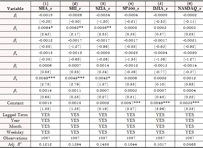 The number in the parentheses is the Newey-West standard error (Newey & West, 1987). The sample period runs from February 14, 2017 to February 12, 2020. *, **, and *** denote significance at the 10%, 5%, and 1% levels, respectively. The results appear in Table 6.
