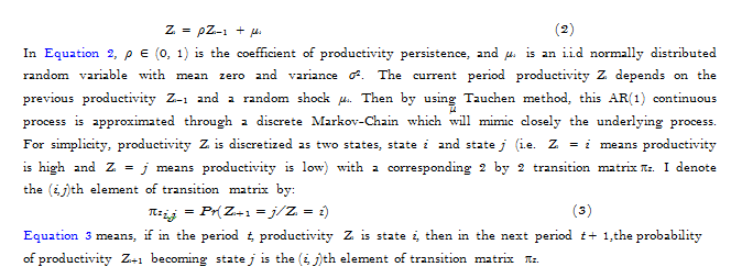 Equation 1 determines the household’s labor income in the working periods, which depends on its age t, health status Ht and productivity Zt,. The productivity process Zt follows AR(1) process: