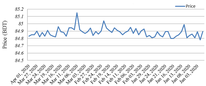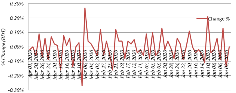 The daily basis statement present on Jan 10, is 0.21%. It is clear that the decreasing rate on Jan 30, is -0.02 that means an unstable exchange rate. Early on Feb 03, it stood at -0.03%, while in the mid-on Feb 18 it moved to 0.08%, and at the end of the month it stood at o.12%. This is the evidence of volatility. In the beginning of Mar 02, it changed 0.06%, in middle 0.01% and in the end of Mar 27 it was present at 0.09%. Finally, April started with a negative change. On Apr 01 it is present at 0.02% which also implies instability of the exchange rate in Bangladesh.