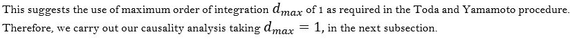The non-stationarity of two series found in the literature (Andrews, 1987; Toda & Phillips, 1993) leads to a possible solution provided by Toda and Yamamoto (1995). The authors address the problem by implementing the Granger causality using the standard Wald test while specifying a VAR level with augmented lags. Their procedures allow the causality analysis regardless of stationarity order and cointegration results. To implement The Toda and Yamamoto Procedure, the following steps are required: