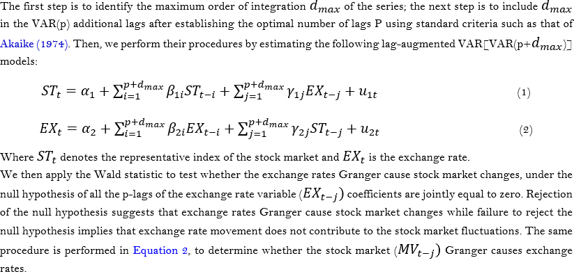 If the null hypothesis is rejected in Equations 1 and 2, this suggests a bidirectional causality between exchange rates and the stock market.