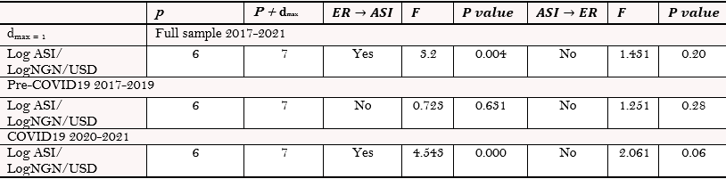 As unit root tests suggest the order of integration of the concerned variable series, we employ the augmented Dickey-Fuller test (ADF) (Cheung & Lai, 1995; Dickey & Fuller, 1981) in determining their order of integration. In addition, we implement the ADF test with the assumption of either a constant or linear trend for each variable. Table 2 reports the ADF results for the stock market and the bilateral exchange rates of the Naria against the U.S. Dollar using their log-transformed series in both levels and first differences for the following cases: full sample periods, pre-pandemic sub-sample periods, and pandemic sub-sample periods.