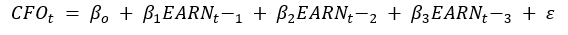 Several analytical methods have been used for examining the predictability of operating cash flows. In specific investigations, ordinary least squares regression has been used for constructing a prediction model (Al‐Attar & Hussain, 2004) . This study utilised the earnings model for predicting the potential cash flows of the sample. The dependent variable was the operation cash flows while earnings from the previous one to three years were the independent variables. As such, the relationship between historical earnings (EARN) and cash flow from operations (CFO) was analysed as follows: