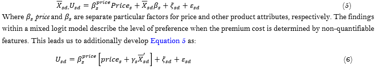 A simulated highest probability measurement technique with 500 Halton draws was implemented to measure the factors in Equations 3 – 4. Moreover, to investigate how consumers' willingness to pay a premium for DIF products might differ according to their level of confidence, the mixed logit model precisely measures this in terms of extra pay for volume, through the relationships expressed among the product features and the two confidence estimates. Analyzed using the regular technique of measuring premium payments (Wang, Mao, & Gale, 2008), the model used to declare the extra cost has two benefits. First, it allows the choice of price to be heterogeneous and may, therefore, result in more accurate extra cost estimates (Danthurebandara, Yu, & Vandebroek, 2011; Touri, 2020). Secondly, it measures the extra cost to consumers precisely. To achieve this, it prevents the random selection of the premium cost distribution, which, taken as the partition of the coefficients of the non-quantifiable features along with the coefficient of price, might point to uncommon distributions of extra cost principles. More explicitly, it advances Equation 1 as a function of price, price s, and includes other product features: