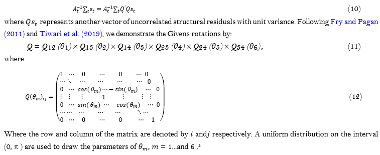 Furthermore, following Cogley and Sargent (2001) degrees of freedom are multiplied by the OLS estimates on training sample to obtain the appropriate scale matrix. Paying a close attention to Chinese economy in which exchange rate changes affect all aspect of the economy, we impose some sign restrictions by assuming that exchange rate shocks on GDP, price level and interest rate are all negative, meaning that a depreciation is expected to boost net exports, hence the GDP. It is also expected to be inflationary and result in high interest rate.2 Following Franta et al. (2014) and Tiwari et al. (2019), the sign of a response for output, price level and interest rate imposed for four quarters and exchange rate reaction is restricted to only the immediate impact of a shock. We use Givens rotations to implement identification restrictions. This approach is recommended by Fry and Pagan (2011) where the sign restrictions are important in transforming structural residuals into reduced-form residuals. For an orthonormal matrix Q, the following relation must hold: