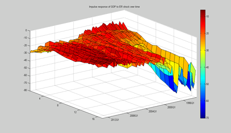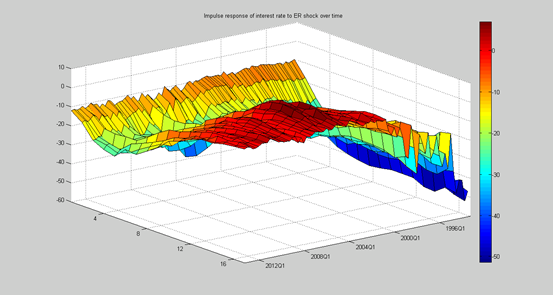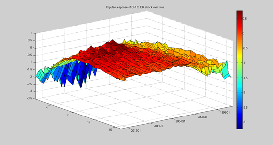 Exchange rates are said to affect output Gross Domestic Product (GDP) through two channels: the channel through which expenditures are switch from imports to domestically produced goods and the interest rate channel. The combined effects of exchange rate shocks on GDP, CPI, Consumer Price Index. and the interest rate are presented in Figures 1- 3 respectively. As can be seen, economic activity or output is weekend subsequent to exchange rate appreciation. We observe that exchange rate shocks have their strongest effects on GDP at approximately 4, 8 and 12 quarters subsequent to a shock Figure 1. However, effects on prices are long lasting Figure 2. Unlike Taylor (2000) who suggested that exchange rate pass-through declines over time, we do not find this trend in China. As for the impact on interest rate, we find that exchange rate appreciation results in lower interest rates Figure 3. Exchange rate appreciation is said to be anti-inflationary policy since it lowers cost of imported goods. This could reduce the burden of monetary policy. From Figure 1 we gather that at different time-horizon, the transmission of exchange rate shocks has become stronger over time, including during the period of the recent financial crisis. This effect is particularly evident for output (GDP). From Figure 2 we learn that reaction of prices to an exchange rate shocks has been stable over time. Figure 3 reveals that the reaction of interest rate appears to be more persistent in recent period than in the past. Our findings suggest that China has conducted an exchange rate policy that is designed to maintain economic stability consistent with economic growth in China.