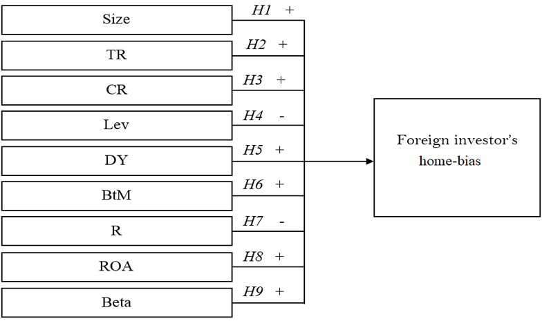 2. Firm size is a firm characteristic that represents both asymmetric information and liquidity, which are important hidden barriers to international portfolio investment. Kang (1997) used firm size as an indirect proxy for liquidity, explaining that foreign investors prefer to choose large firms partly because their stocks are usually highly liquid 'blue chip' stocks. The vast majority of studies on corporate investment bias, including Kang (1997), Dahlquist and Robertsson (2001), Lin and Shiu (2003), Liljeblom and Löflund (2005), Kim and Yoo (2009), Diyarbakirlioglu (2011), Blenman and Le (2014), and Batten and Vo (2015), have all shown a statistically significant impact of firm size on foreign investors’ home bias and foreign ownership. Most of these studies explained this relationship by suggesting that firm size is a proxy for the degree of information asymmetry: the larger the firm, the more complete and timely the information, minimizing the information gap between domestic investors and foreign investors. In addition, foreign investors are more likely to know about large-scale enterprises than small-scale enterprises – the size of the enterprise is a proxy for the popularity and recognition of the business. Firm size can also be a proxy for liquidity, based on the argument that the larger the firm, the larger the volume. Therefore, this study hypothesized that: