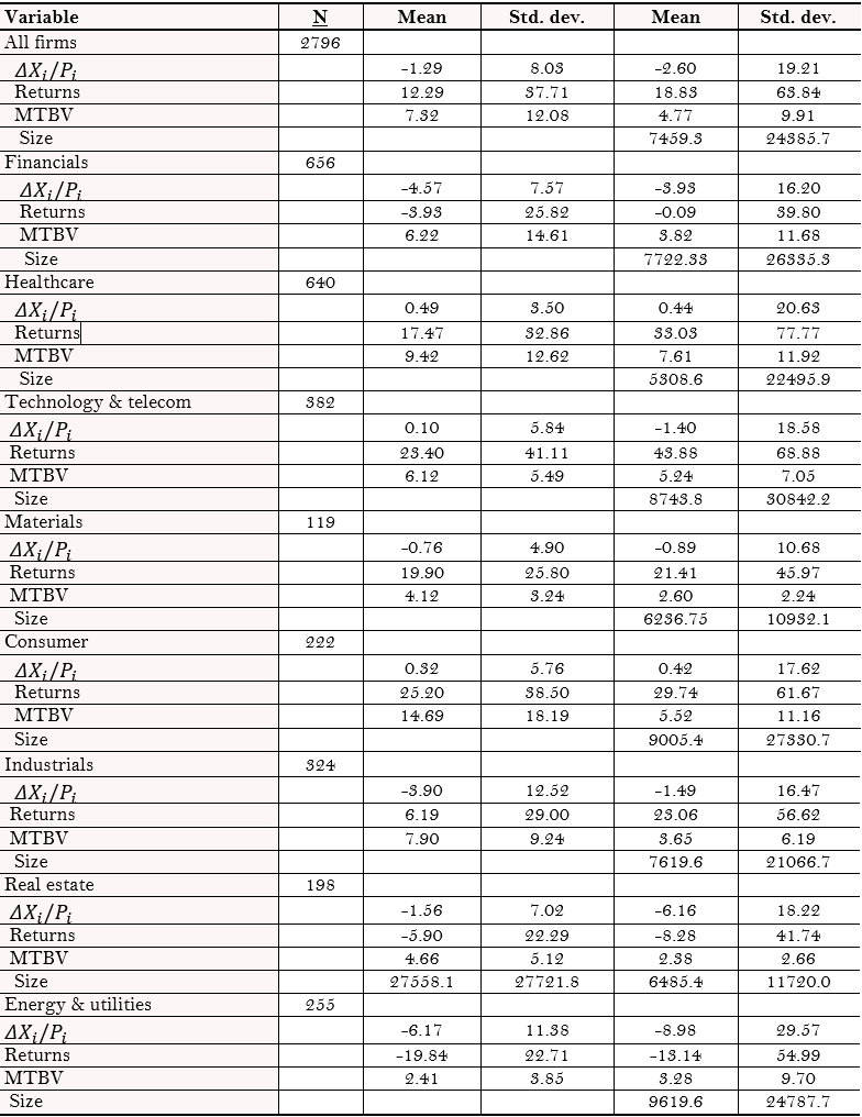 The empirical analysis of this study covered twelve months, starting from January 1, 2020. The initial sample included all publicly traded U.S. firms with the required data available on Standard & Poor’s Global Market Intelligence. Firms with a stock price under $1 and those with fiscal years ending in months other than December were excluded from the sample. The final sample thus consisted of 2796 individual firms in eight industries. We used the "1st Level Primary Industry Classification" of the S&P Market Intelligence database to classify the sample into eight industrial sectors. Appendix A provides additional information on the constituents of each industrial group.