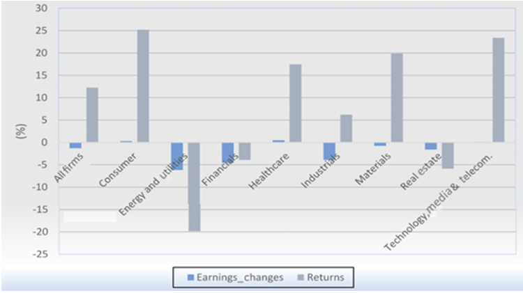 Figure 1 shows that the Energy & Utilities sector experienced the largest decline (-6.17%) in its earnings. The reason for this decline is likely that large oil companies faced a substantial change in aggregate demand for oil along with oil price shocks. Lockdowns were extensively enforced in the second quarter of 2020, which decreased oil consumption and, therefore, oil prices. Additionally, the Energy and Utilities sector experienced the largest negative value-weighted stock returns (-19.84%) during the sample period, supporting the argument that market forces incorporate earnings information into stock prices.