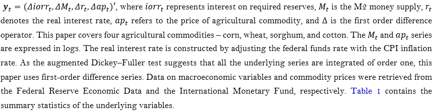 Keywords: Agricultural commodity price, Interest rate on reserves, Monetary policy, Vector autoregression, Time series analysis, United States.