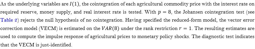 Table 2. Johansen cointegration test results for each agricultural commodity price series with the interest rate on required reserve, money supply and real interest rate.