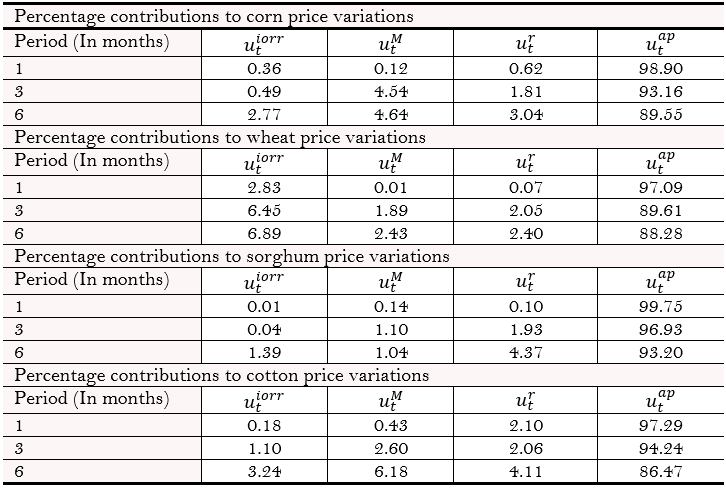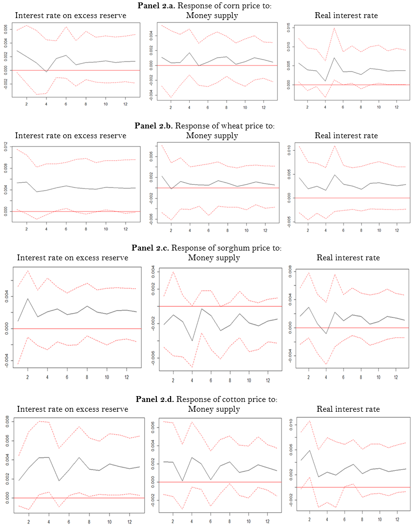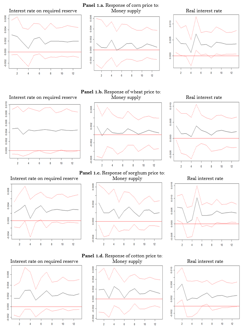A money supply shock positively impacted the prices of both corn and cotton, though with a delay of three months. The effect reached a maximum after four months; however, it disappeared after five months. Similarly, sorghum prices increased in reaction to money supply shock with a lag of three months, reaching the maximum after seven months. However, the response of wheat prices to the money supply shock was relatively weak.