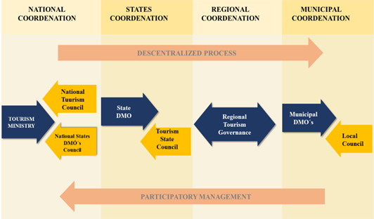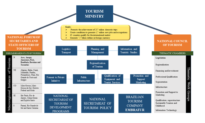 The Brazilian strategy for competitiveness in tourism focuses on the decentralization of central power management for regional and local governance (Hall, 2011a). This demonstrates the correct form of transferring technology and power to destinations and controlling the process of tourism development, thereby enhancing the resources and attractions of each place or region. The structure and organization of domestic tourism encourage cooperation and participation between different government sectors and private sectors as well as a host of institutions representing civil society, thus making the National Tourism Council responsible for planning.