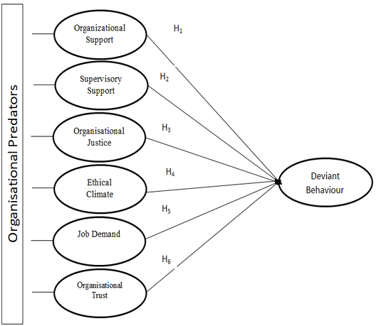 Past researchers argued that certain organizational related factors make organisations more vulnerable to employees’ workplace deviant behaviour (Henle, 2005; Abdul, 2008). From the social exchange perspective, individuals in organisation are more likely to reciprocate with destructive behaviour with the existence of workplace condition (Alias, 2013). Researchers found that organizational-related factors such as organizational ethical climate (Andreoli and Lefkowitz, 2009); organization justice (Jones, 2009); perceived organizational support (Monnastes, 2010; Balducci et al., 2011) supervisory support (Balducci et al., 2011) job demand (Balducci et al., 2011; Fransson et al., 2012) organizational trust (Thau et al., 2007; Balducci et al., 2011) are pertinent factors in employees’ inclination in destructive behaviour.