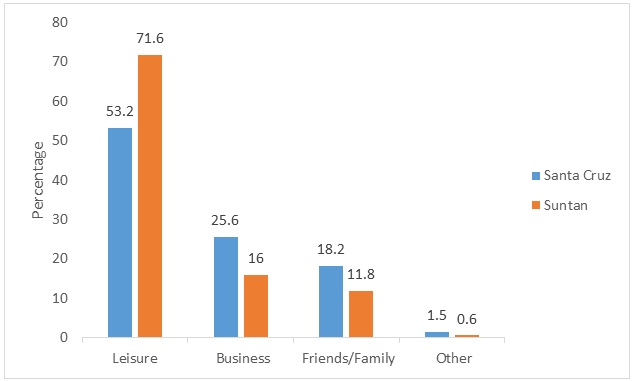 Figure 4 illustrates why tourists visited the two resorts. At Santa Cruz Beach, 53.2%came for leisure, 25.6% for business, 18.2% with friends and/or family, and 1.5% for other reasons such as spiritual healing, religious purposes, or solitude. At Suntan Beach, 71.6%) came for leisure, 16% for business, 11.8% with friends and/or family, and 0.6% for other reasons.