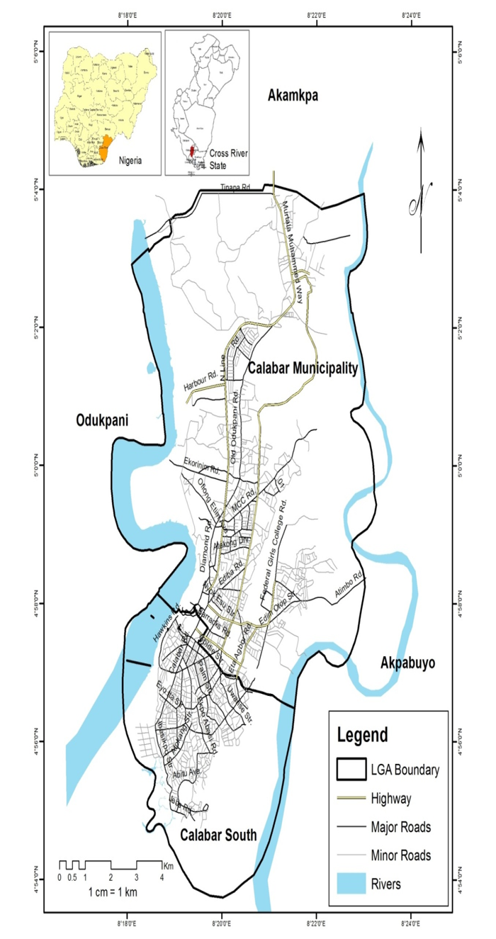 The study area is Calabar Metropolis: (Calabar South and Calabar Municipality), which lies between latitude 500 32’ and 400 22’ North and longitude 700 50’ and 900 28’ East, it is about 21, 481sqkm in size. It is situated within the tropics and bounded with Odukpani Local Government Area in the North; Akwa Ibom in the South and the Republic of Cameroon in the East; while the West is characterized by a moderately undulating peninsular with a descending land towards the Calabar River and a gradual slope towards the Kwa River at the East. Calabar also referred to as “Canaan City” is a city in Cross River State, the original name for Calabar was “Akwa Akpa” from the Efik language. The city is adjacent to the Calabar and Great Kwa rivers and creeks of the Cross River (from its inland Delta). With coordinates of: 40 5 70’ “N8019’ 30” E/4.950000 N8. 325000E with a total Area of 406km2 (157sqmi) and a population density of 910/km2 (2,400/sqmi).