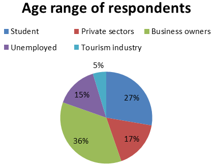 Occupational distribution of respondents Figure 3 revealed that 52 respondents which represent 27% were student, 32 respondents representing 17% were private sectors, 67 respondents representing 36% were business owners, while 28 respondents representing 15% were unemployed, with tourism industry having 9 respondents with a percentage of 5%.