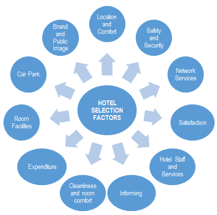 Sohrabi et al. (2012) demonstrate in their study of the factors impacting selection of hotels in Tehran that comfort, safety and security, network services, satisfaction, the service mentality of the staff, recreative informing, cleanliness, room comfort, price, room facilities and carpark.