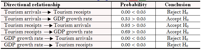 Null hypothesis (H02): Tourism receipts do not cause tourism arrivals and GDP growth rate.