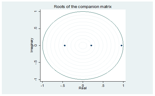 If all the eigenvalues lie inside the unit circle, then the VAR model satisfies the stability condition see Figure 4.