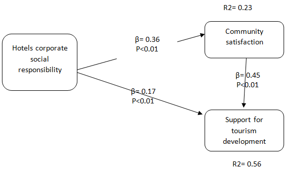 According to Figure 1, the R2 value implies that 23% of changes in residents’ community satisfaction can be explained by hotel social responsibility. It means that conducting corporate social responsibility practices by hotels is one of the key predictable in changes of community satisfaction. The results also show that 56% of changes in residents support for tourism development can be predicted by hotel social responsibility and community satisfaction. The results of hypothesis testing provided in Table 3.