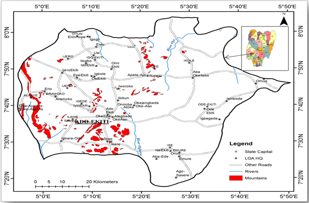 The study on developing cluster for mountains and hills was conducted in Ekiti State, Southwest Nigeria. It was carried out in some selected communities with mountains and hills; Ado Ekiti, Ilokun, (Ado Local Government Area), Efon Alaaye, Obake, Orisumibare, and Oba Ayetoro (Efon Local Government Area), Ijero and Epe (Ijero Local Government Area), Aramoko, Erio, and Okeimesi (Ekiti West Local Government Area), Iyin, Iworoko, Igede (Ifelodun/Irepodun Local Government Area), Igbole Ekiti (Ido/Osi Local Government Area) Abaoke-Ilabo (Ikole Local Government Area), Ewu (Ilejemeje Local Government Area) Ilupeju and Apata-Aje (Oye Local Government Area), Ilawe and Igbara-Odo, Ikogosi, Ipole-Iloro (Ekiti Southwest Local Government Area), Ikere Ekiti, Atoka, Oke Aso, and Okejegbende (Ikere Local Government Area). Figure 1 Ekiti State is located between longitudes 40 0 51I and 500 451I East of the Greenwich meridian and latitudes 70 0 151 and 800 51I North of the Equator. It lies south of Kwara and Kogi State, East of Osun State and bounded by Ondo State in the East and in the South. The land Area is 5,887.890sq km. The size, latitudes and longitudes of the selected towns and communities in Ekiti State for this study are in Table 1. The land of Ekiti is known for its forest resources, notably timber. However, because of favourable climatic conditions, the land enjoys luxuriant vegetation. The flora composition in Ekiti State includes trees species such as Acacia albida Delile (Mimosaceae), Albizia fernginea (Mimosaceae), Alstonia boonei De wild (Apocynaceae), Berlinia coriacea Keay (Caesalpiniaceae), Antiaris toxicaria Lesch (Moraceae), celtris zenkeri Engl (Ulmaceae), Melicia exlcesa (Welw) Benth (Moraceae), Khaya grandifoliola C.DC. (Meliaceae), etc.Also, animal species such as grass-cutter (Thyronomys swinderianus), Maxwell duiker (Cephalophus maxwelli), Bush pig (Potamochoerus porcus), ground squirrel (Protoxerus stranger), African giant rat (Cricetomys gambianus), Bush buck (Tragelaphus scriptus), etc. are predominant in the area. The State enjoys tropical climate with two distinct seasons. These are the rainy season (April–October) and the dry season (November–March). The annual rainfall values in Ekiti in the last 20 years ranges between 996.4mm minimum to 1549.4mm maximum (Owolabi, 2019). Temperature ranges between 21° and 28 °C with high humidity which ranges between 65 – 100% during the dry and wet season respectively. The south westerly wind and the northeast trade winds blow in the rainy and dry (Harmattan) seasons respectively. The occupation of indigenes of Ekiti State is predominantly farming because the land enjoys favourable climatic conditions with luxuriant vegetation, where food crops such yam, cocoyam, cassava, rice, and maize are grown in large quantities. There are other notable crops like Cocoa and Kolanut, while and other varieties of fruits such oranges, pineapples, cashew, Plantain, Bananas etc. are cultivated in commercial quantities. As a matter of fact, Ekiti people are culturally homogeneous and speak a dialect of Yoruba language known as Ekiti. This homogeneous nature confers on the state some uniqueness among the states of the federation. Ekiti State is generally an undulating part of the country with a characteristic landscape that consists of old plains broken by step-sided out-crops that may occur singularly or in groups or ridges. Such rocks out-crops exist mainly at Aramoko, Efon-Alaiye, Ikere Ekiti, Igbara-odo ekiti, and Okemesi Ekiti. The State is dotted with rugged hills, notable ones being Ikere-Ekiti Hills in the south, Efon-Alaiye Hills on the western boundary and Ado-Ekiti Hills in the centre. Many hills in Ado Ekiti are Ekiti Hills located along Iyin road. Also, Okuta gbokuta lori hills (Hill carries hill) Olota hills are domiciled in Ado-Ekiti. Generally, Ekiti land is naturally endowed with numerous natural resources such as Granite, Kaolin, Columbite, Channockete, Iron ore, Baryte, Aquamine, Gemstone, Phosphate, Limestone, Gold among others. These are largely deposited in different towns and villages of Ijero, Ekiti west, Ado-Ekiti, Ikole Ekiti, Ikere, Ise-Ekiti, Okeimesi, Aramoko, Igbara-Odo, Erio, and Osi Ekiti.