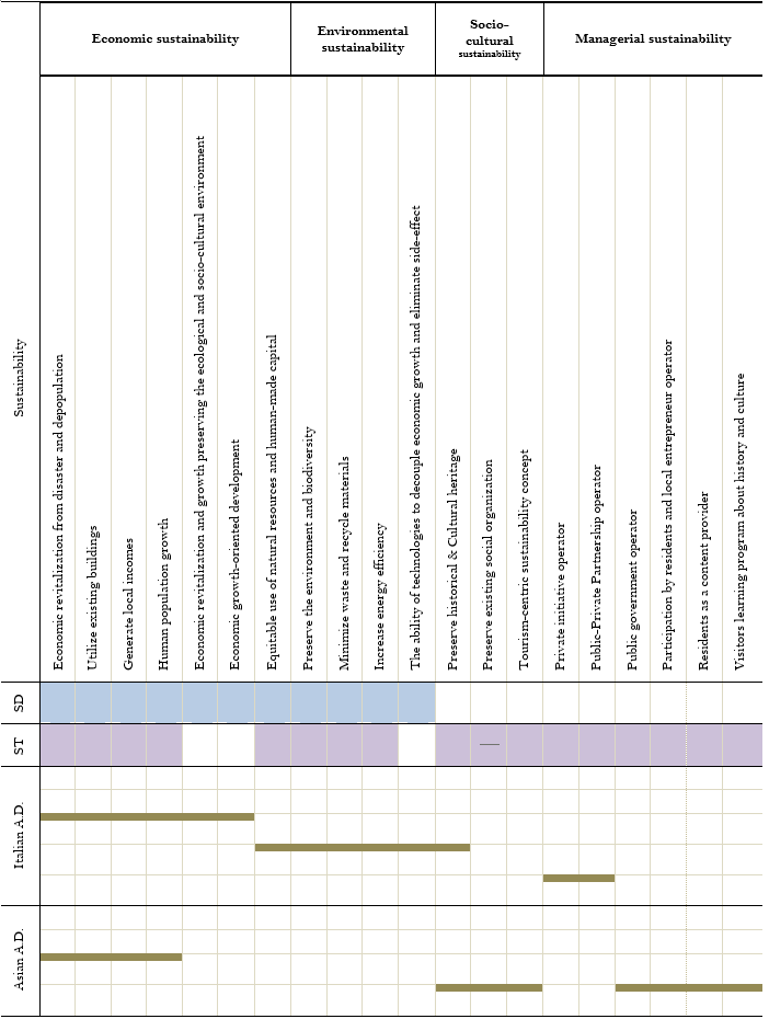 This study is structured as follows: The following section will briefly explain the terminology and concept of sustainability discussed in A.D. and review the whole cases in Italy and East Asia to categorize development characteristics, both from Europe and East Asia. Analysis of the case studies is followed after comparing both regions' case studies. After analysis results, this study concludes with implications and application for more sustainable A.D. hotels.