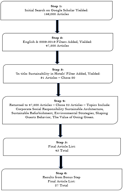 The authors started the research project by devising a plan to complete the research, which started as a result of the author’s curiosity & interest in the topic. The first step was to formulate the questions that the authors wanted to answer in research, which resulted in: what are the profiles of existing literature on sustainability in hotels and what are the topics being included in existing literature. Step 2 was determining the criteria that was going to be used to determine the usefulness of the articles that would be reviewed, which varied, to gain a wide array of opinions, and points of view on the topic. The main stipulation that was held throughout all references was that the articles could be no older than 10 years old.The third step was to search on google scholar for all articles relating to ‘sustainability in hotels’, which resulted in 146,000 articles. The authors then applied filters such as “English”, and timeline of “2009-2019”, which then led to 47,800 results. At this point, the authors decided to consider articles which included “sustainability in hotels” within the title, in order to achieve a narrower scope of information, which yielded 91 results. This then led into Step 4, where the authors scaled over about half of the 91 articles and ended up choosing 20 of those articles to review, which is when the authors circled back to the 47,800 results from step 3, to see what other types of ‘sustainability’ research was available, in order to give research a more well-rounded approach / feel to it. From this search, the authors then extracted another 25 articles which included topics on sustainable buildings, sustainable technology, sustainable behavior, etc. (as mentioned above). With step 5, the authors began the content analysis, and started the first drafting of the research paper. For the final step obtained 25 articles. The authors decided to add a bonus step, which was a combination of steps 4 & 5 until the final draft is achieved. Step 3 and 4 (&bonus step) are shown in a visual below in Figure 3.