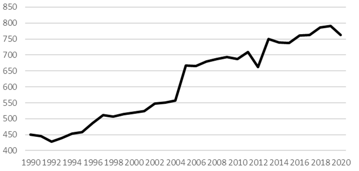 Between 1990 and 2020, the number of museums in Romania increased by 69.6% from 450 units in 1990 to 763 units in 2020 (see Figure 1). Despite this, moments of decline include in 1992 when the number of museums fell by 4.9% compared to 1990. In 2010, the number of museums also fell by 1% compared to 2009. 2012 marked the sharpest decrease of 6.5% compared to 2011, from 709 units to 663. In 2014, the fall was 1.5% compared to 2013, and in 2020, the fall was 3.5% compared to 2019.Between 1990 and 2019, the number of visitors to museums and public exhibits in Romania increased by 73.1%, from 10.5 million people in 1990 to 18.2 million in 2019 (see Figure 2). There were decreases in the number of visitors in 1991, 1992, 1994, 1999, 2003, 2006, 2010, and 2014. The most significant reduction was in 2020, amid restrictions triggered by the COVID-19 pandemic.
