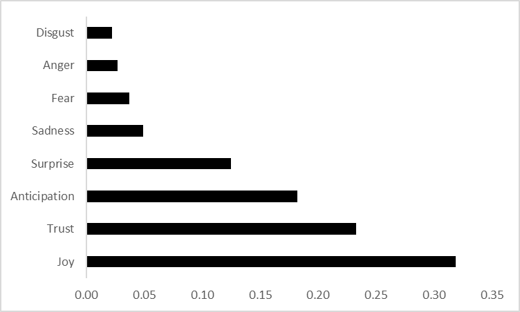 Comparing the percentage of each emotion (see Figure 5 ), the results show that “joy” has the most significant share of almost 32% of all the meaningful words in the text. “Disgust” and “anger” have the lowest share. In each case, the associated words represent less than 3%.